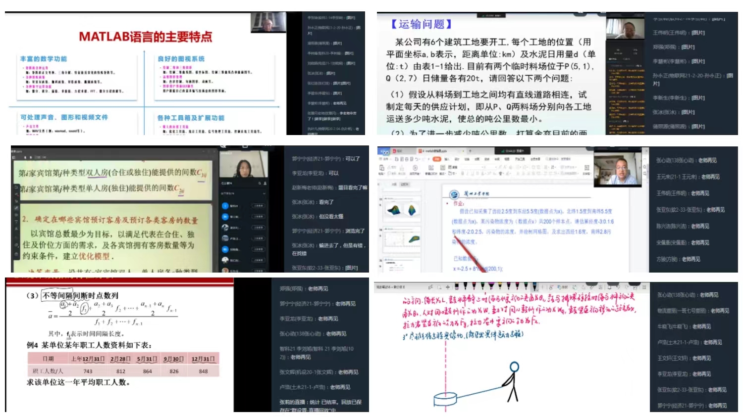 培训以钉钉直播的方式进行,6位老师分别从Lingo、Matlab数学软件的应用、问题重述与分析、数据分析与处理及规划、优化,统计模型建立等方面给学生进行了细致地讲解和相应的训练。培训中,学生和指导老师积极参与,学生主动向主讲教师请教问题。同学们通过查找文献资料、书籍阅览等方式进行论文的学习和写作;各小组同学与指导老师通过微信、钉钉等平台进行线上互动交流。本次培训拓展了学生数学建模知识,提升了论文写作能力,为即将于9月15日举行的全国大学生数学建模竞赛奠定了良好的基础。8天的培训在大学生数学建模协会负责老师董珺精心组织和大学生数学建模协会负责同学的协助下圆满完成。