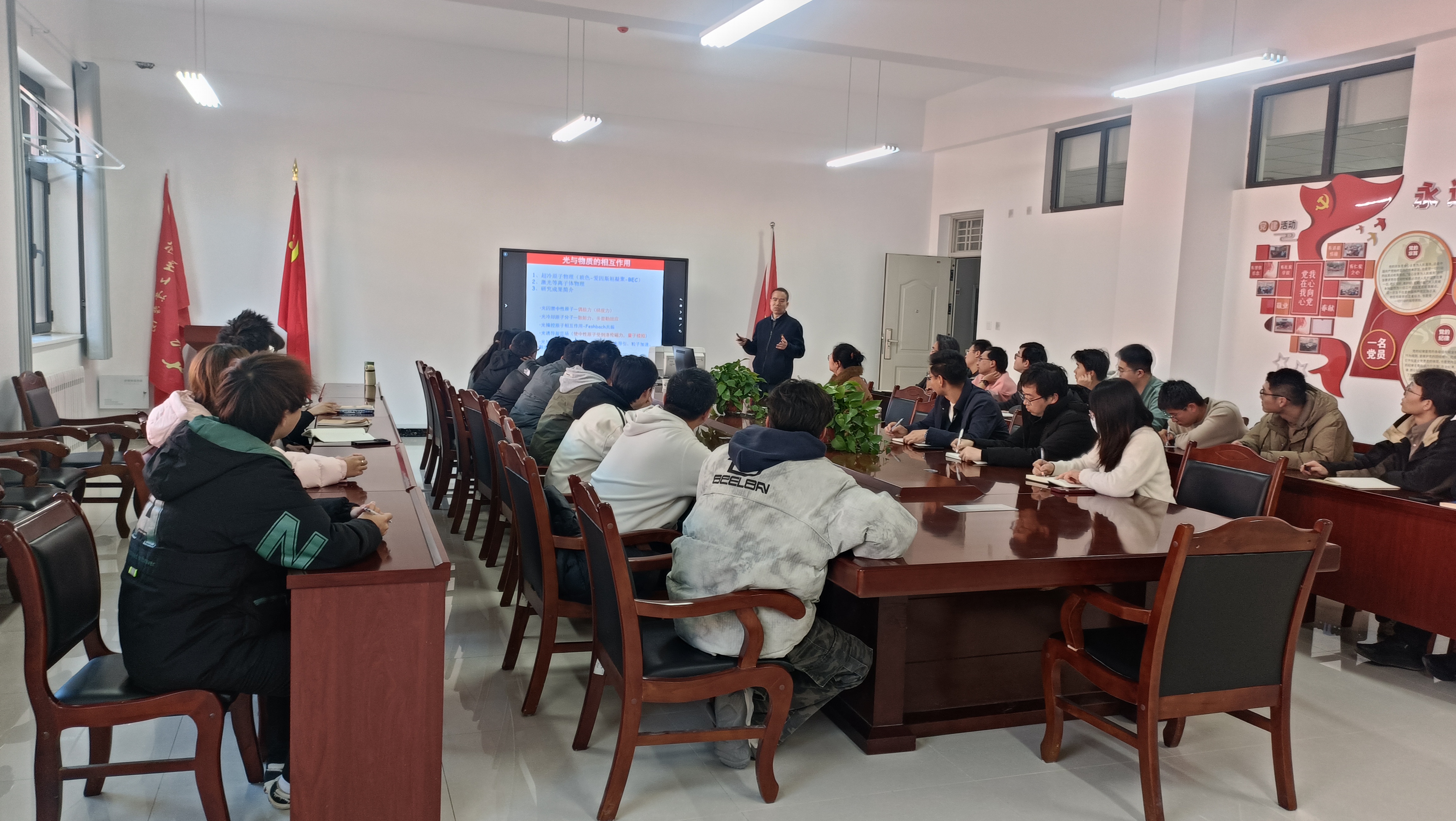本次报告中,薛教授清晰地勾勒出从基础技术到前沿探索的冷原子研究路径。报告始于光与物质相互作用的基本原理,详细阐述了通过光晶格技术囚禁原子并利用激光冷却将其制备至超低温的实现方法。以此为基石,自然引出在极低温下实现的玻色-爱因斯坦凝聚(BEC),并综述了其研究现状。进而,薛教授将议题推向当前热点,即以“人工规范场”的实现与调控为背景,以其团队对“玻色梯子系统”的深入研究作为核心案例,展开了详细介绍。
