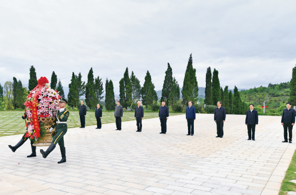 2021年4月25日至27日,中共中央总书记、国家主席、中央军委主席习近平在广西考察。这是25日上午,习近平在位于桂林市全州县的红军长征湘江战役纪念园,向湘江战役红军烈士敬献花篮。 新华社记者 谢环驰/摄